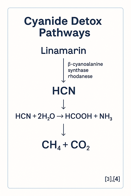 🔸 มีเอนไซม์ธรรมชาติในมันสำปะหลัง (β-cyanoalanine synthase, rhodanese) ช่วยสลาย CN⁻