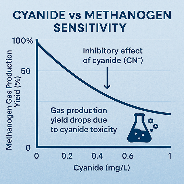 เพียง 0.1–0.2 mg/L CN⁻ ก็เริ่มยับยั้งการสร้างมีเทนได้